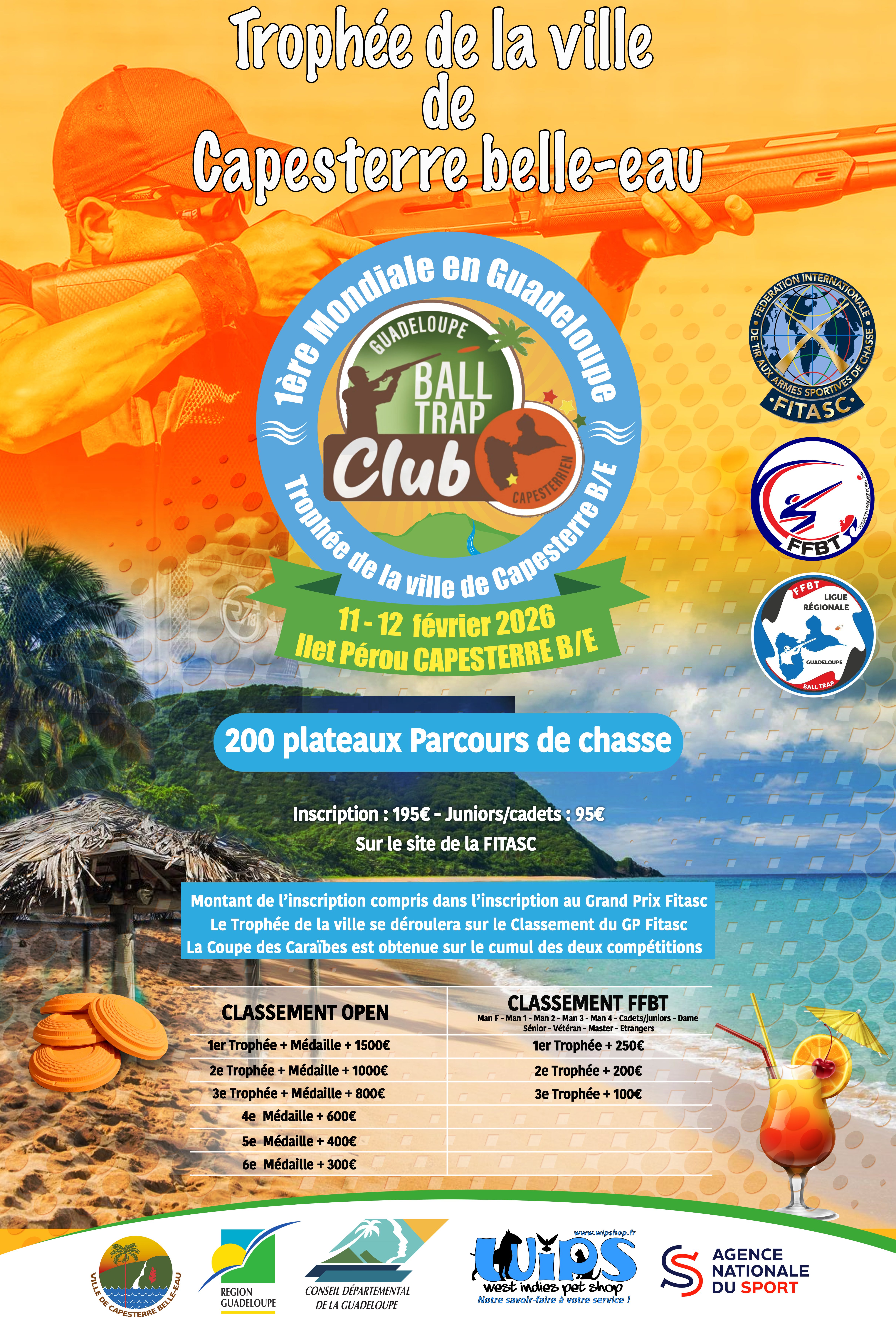 Coupe des Caraïbes 2026 (400 plateaux) Basée sur le cumul des scores du Grand Prix de Guadeloupe de Parcours de Chasse et du Grand Prix de Guadeloupe de Compak Sporting. |