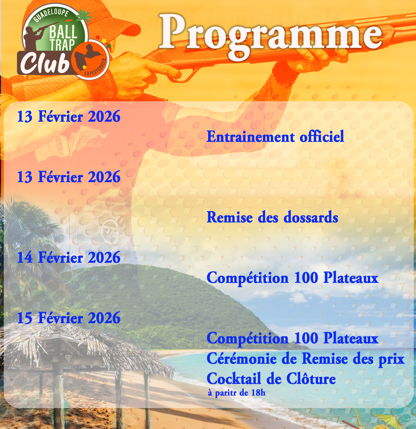 Coupe des Caraïbes 2026 (400 plateaux) Basée sur le cumul des scores du Grand Prix de Guadeloupe de Parcours de Chasse et du Grand Prix de Guadeloupe de Compak Sporting. |