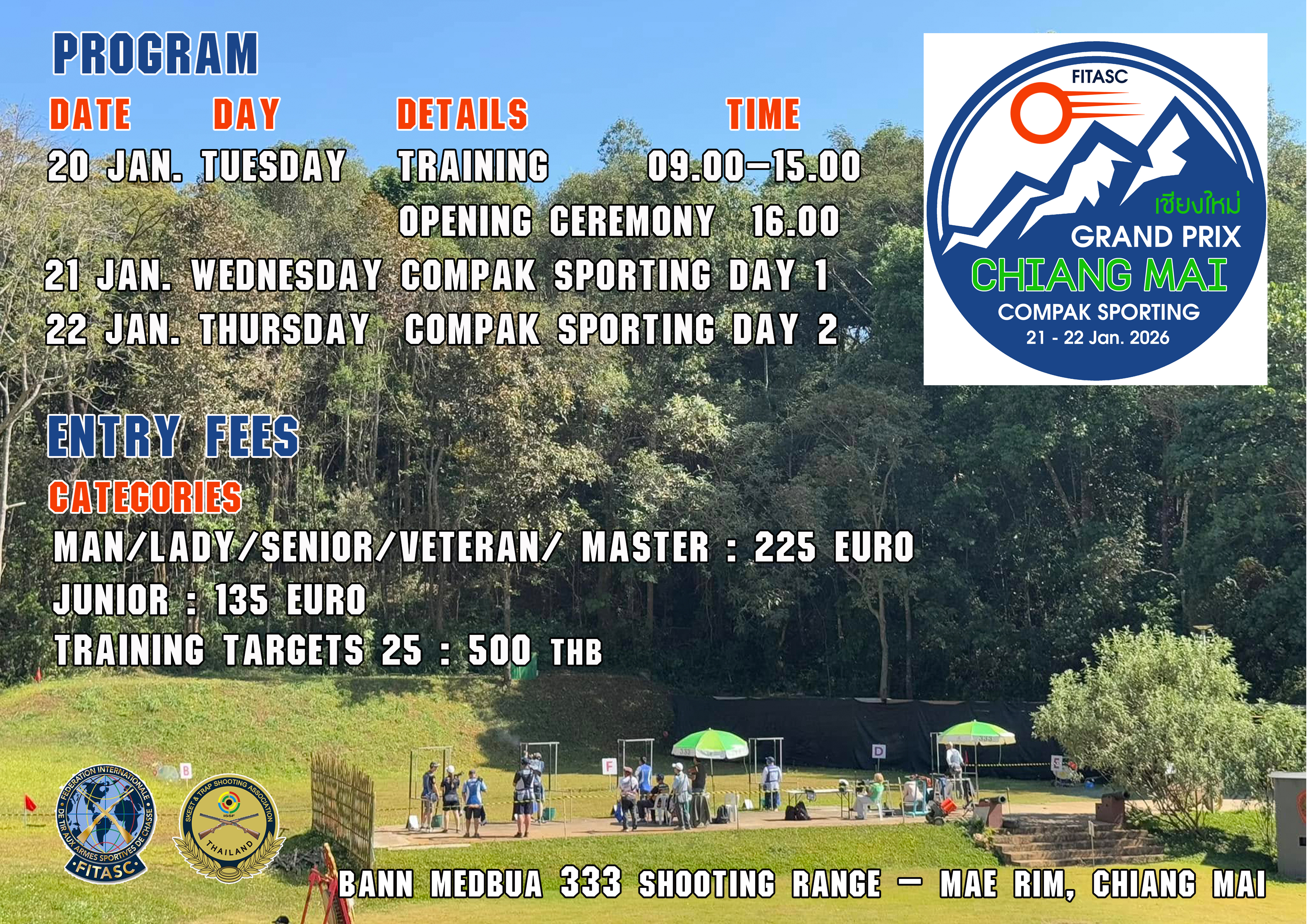 Pour les tireurs qui participent également au 5ème Championnat d'Asie Sporting et au 6ème Championnat d'Asie Compak Sporting à Photharam, veuillez informer le comité d'organisation du stand Photharam que vous participez aussi au Grand Prix de Compak à Chiang Mai. Le comité d'organisation organisera le transport des armes à feu vers Chiang Mai d'ici la fin de la journée de compétition à Photharam.