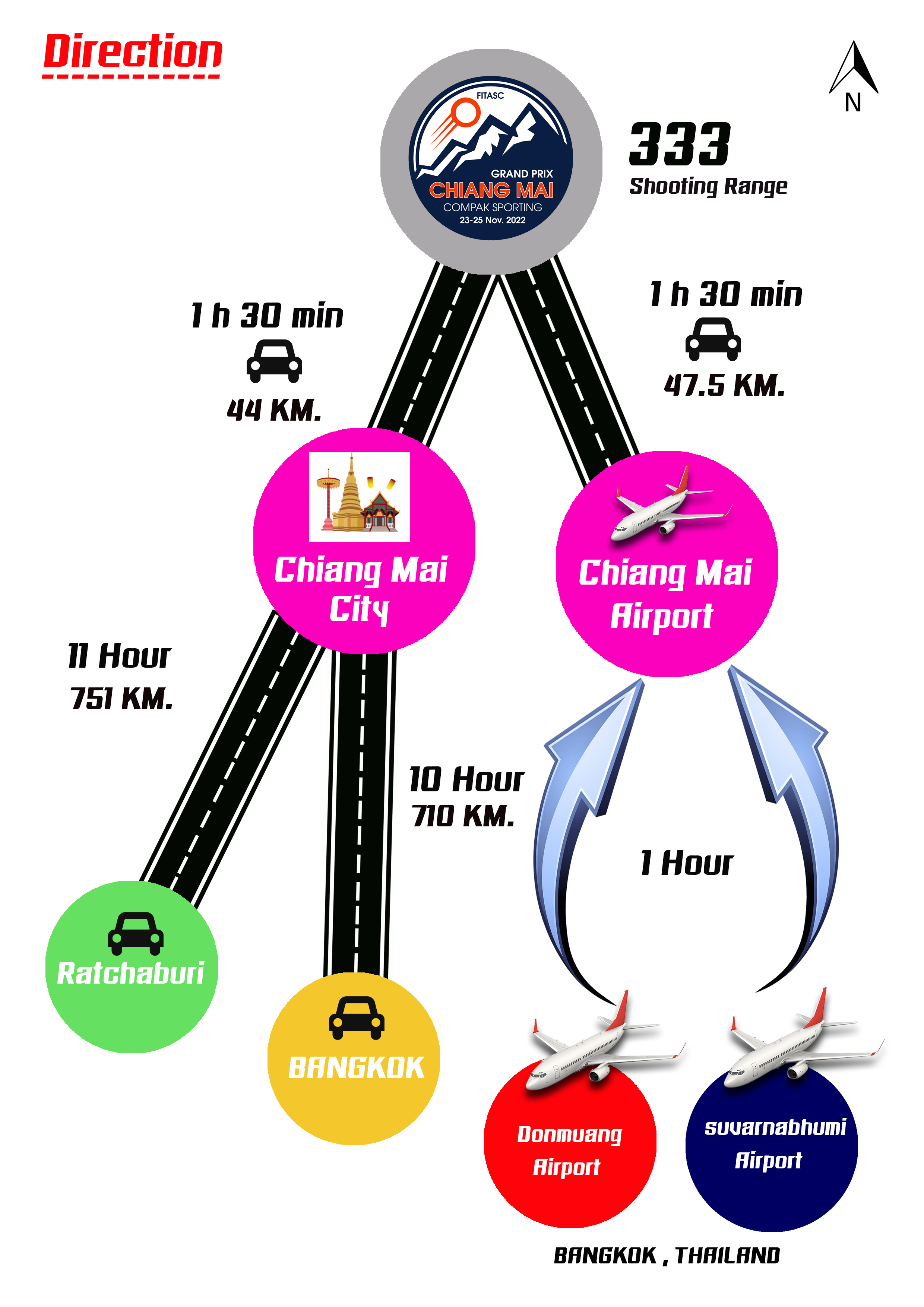 Toutes les armes à feu quitteront le stand de tir de Chiang Mai dans la matinée du 19 janvier 2026. Cela peut prendre 8 à 9 heures de route jusqu'à arriver à Bangkok, dans la soirée du 22 janvier. Le comité d'organisation suggère aux tireurs de réserver votre vol de départ de l'aéroport de BKK à partir du 23 janvier 2026.